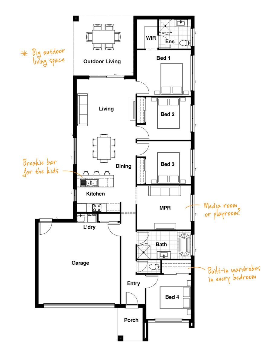 CALL 3801 1328 SEND US AN EMAILFloor plan prepared before construction. Floor plan is illustrative and indicative only. Finished product may differ from floor plan. Whilst every care is taken, no warranty is given or representation is made as to the accuracy or completeness of the information in the floor plan. Prospective buyers should refer to contract documents and should seek and rely on their own advice. All images and renders are indicative only, and the pricing on this website does not include as standard, all external landscaping including clothesline, fencing, driveway and letterbox. As this is impacted by the size of the block, these costs are excluded. Furniture shown is not included. For detailed home pricing please speak to one of our Home Coaches today. 'Nominated block widths are indicative only. Setbacks vary on different estates, please make your own enquiries regarding applicable building setbacks.
